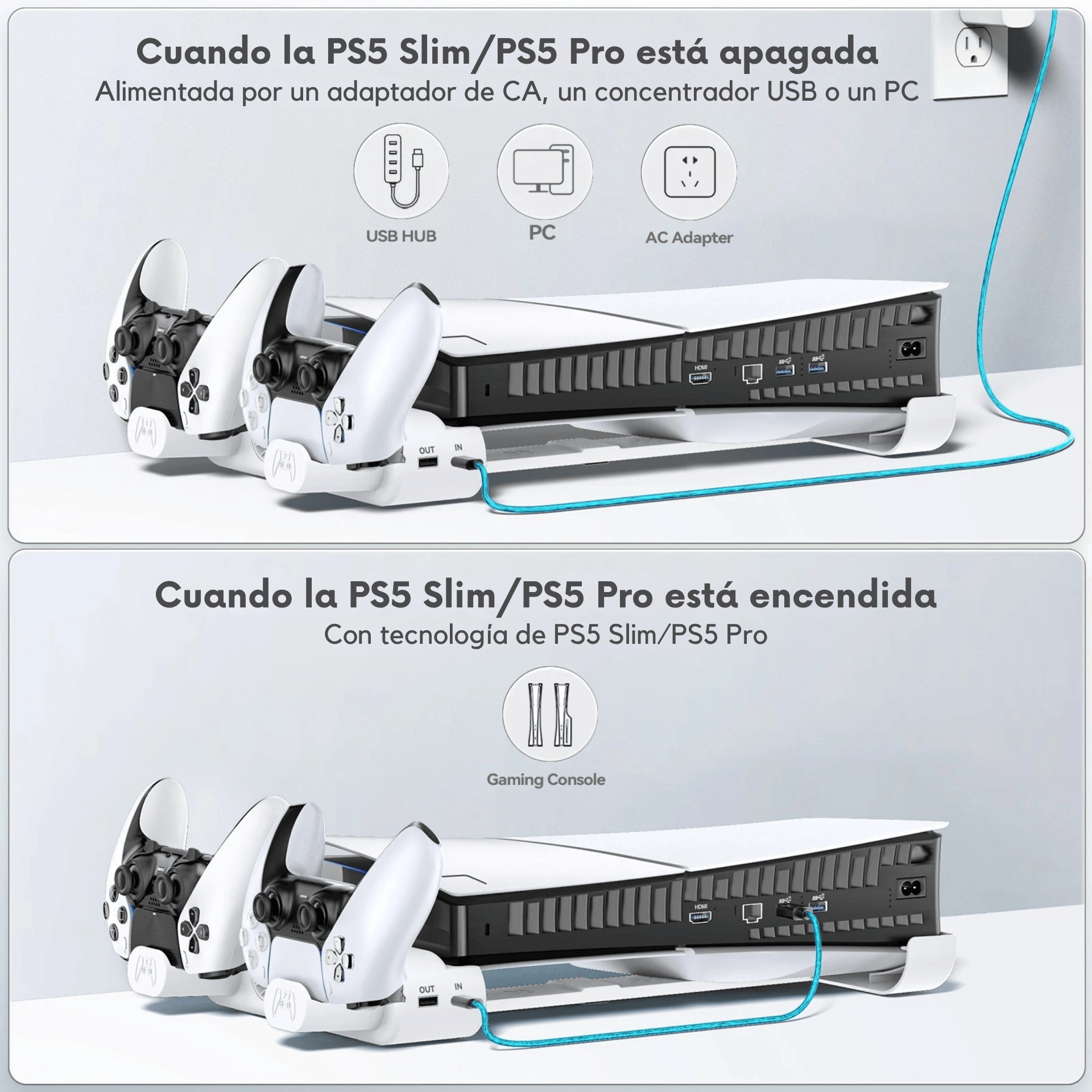 BASE HORIZONTAL MULTIFUNCIONAL PARA PS5 SLIM Y PS5 PRO CON VENTILADOR CARGADOR DUAL Y PUERTOS USB