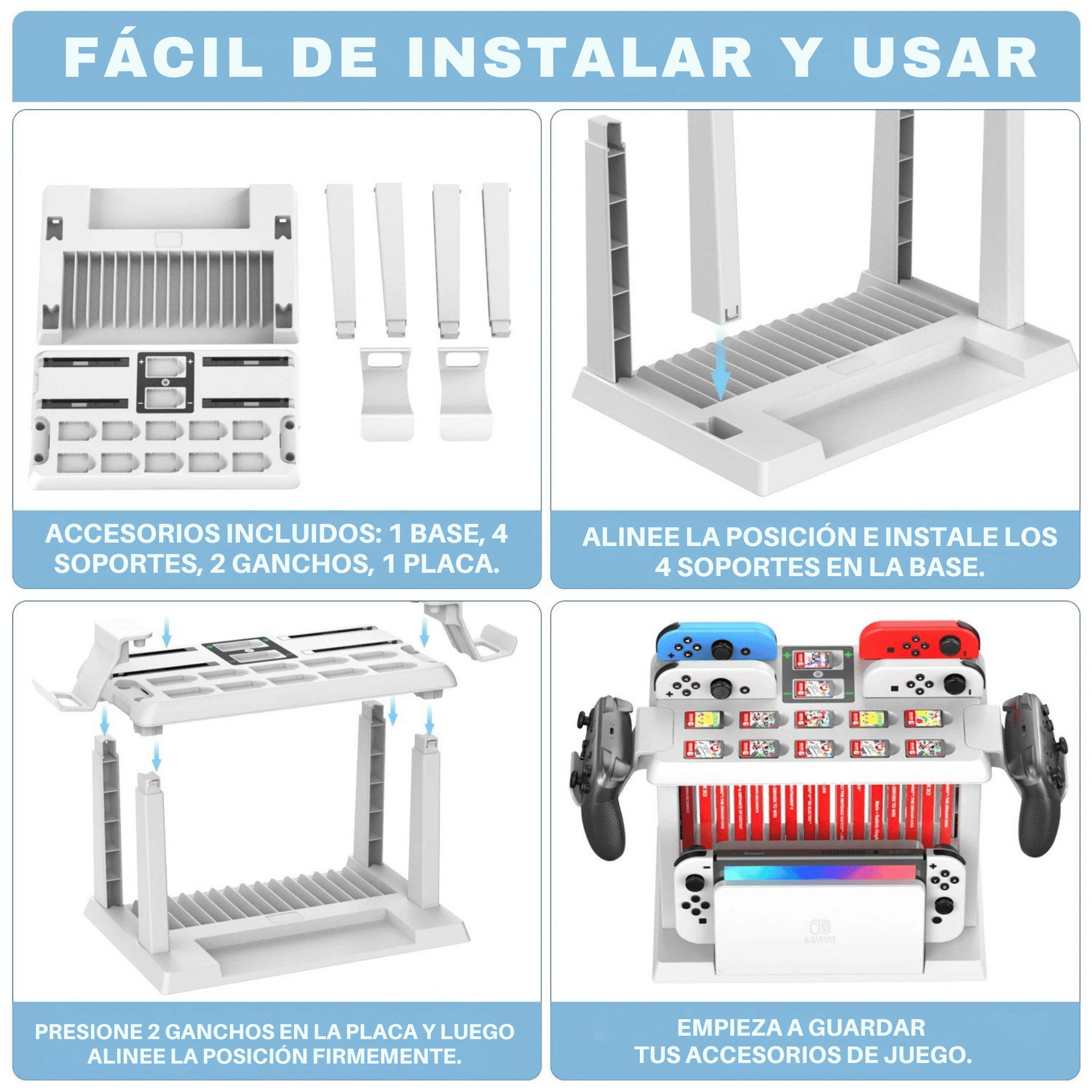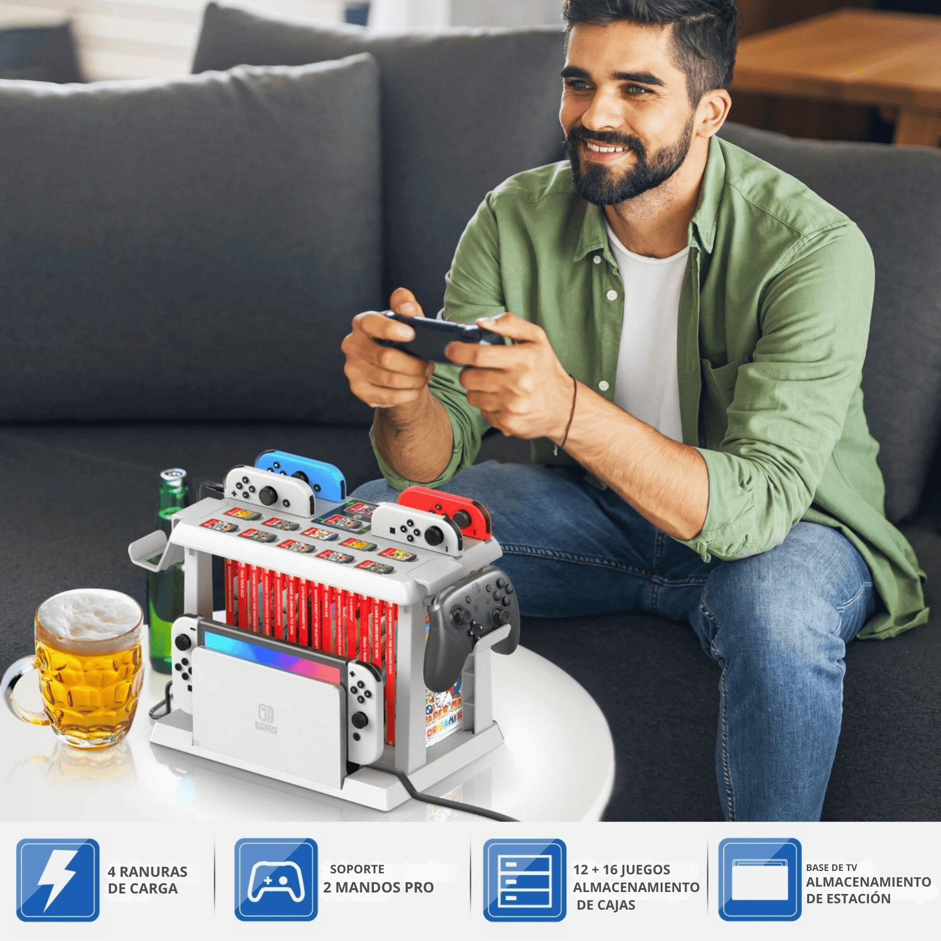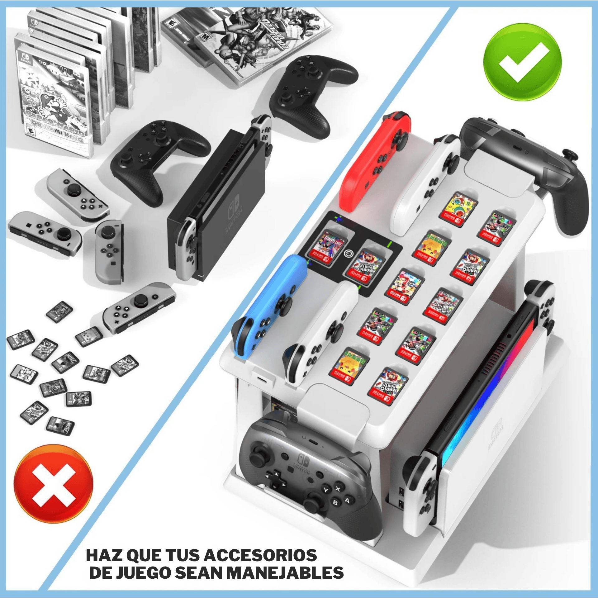 - Estación todo-en-uno para consola Nintendo Switch / Nintendo Switch OLED que incluye organizador de juegos, dock de carga y soporte para mandos.