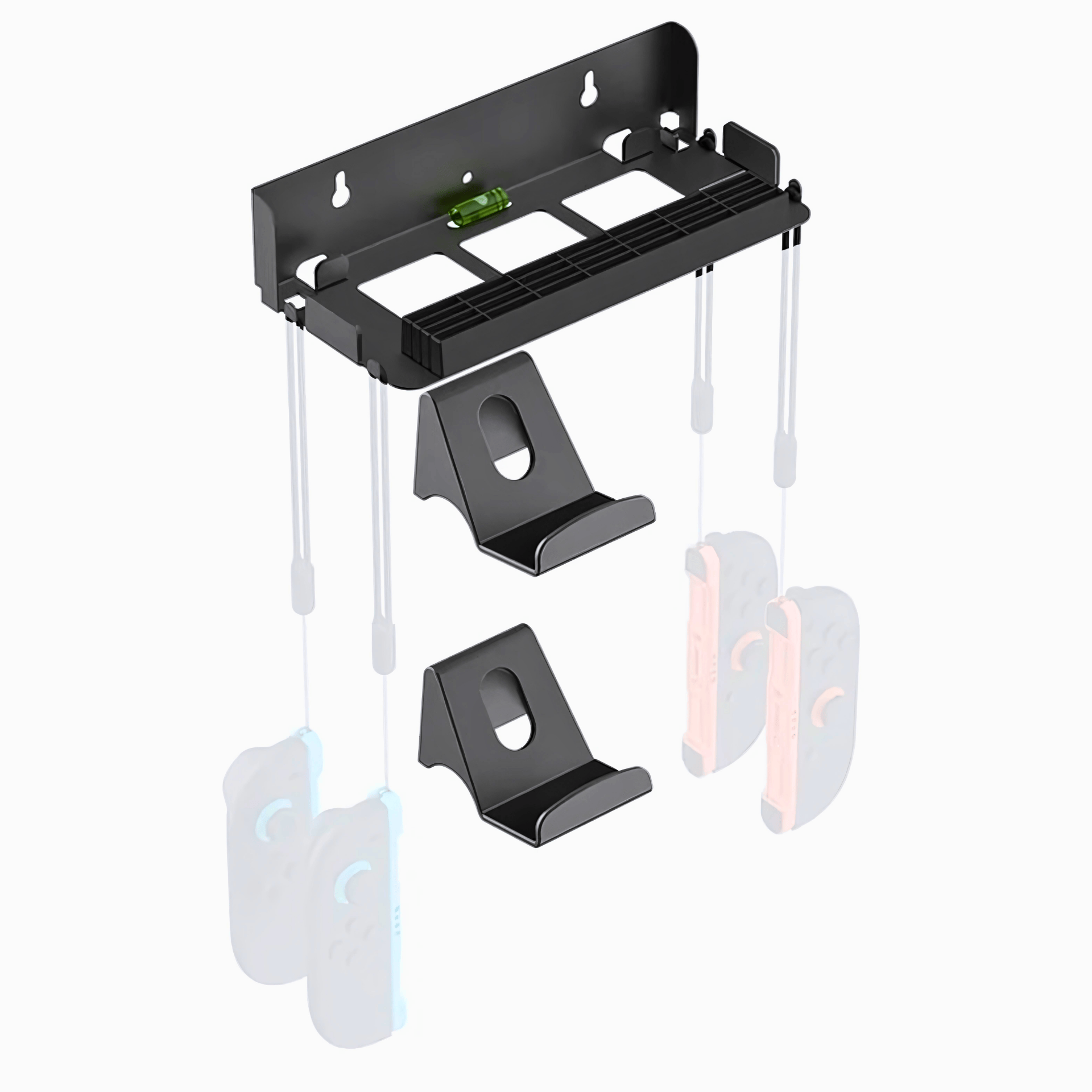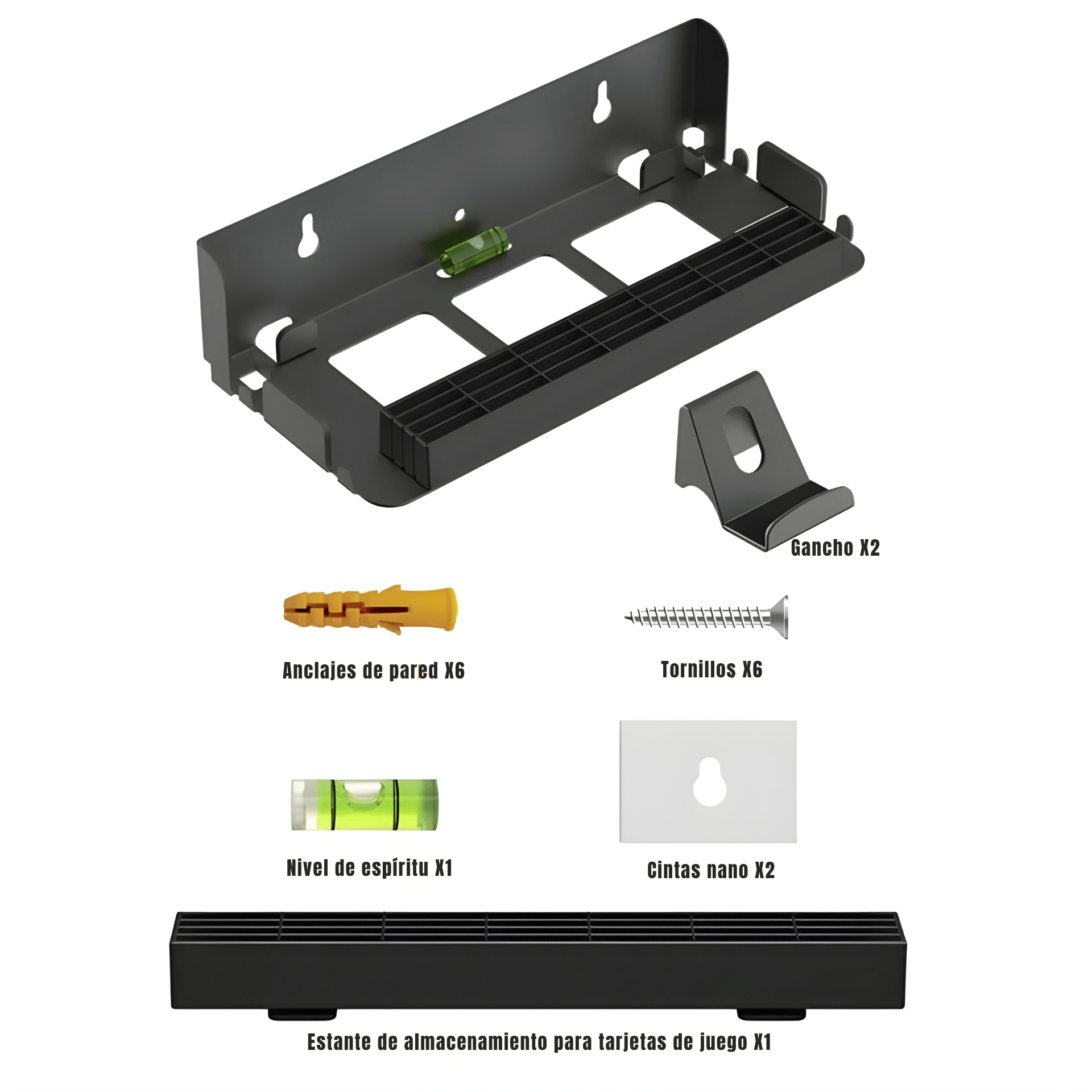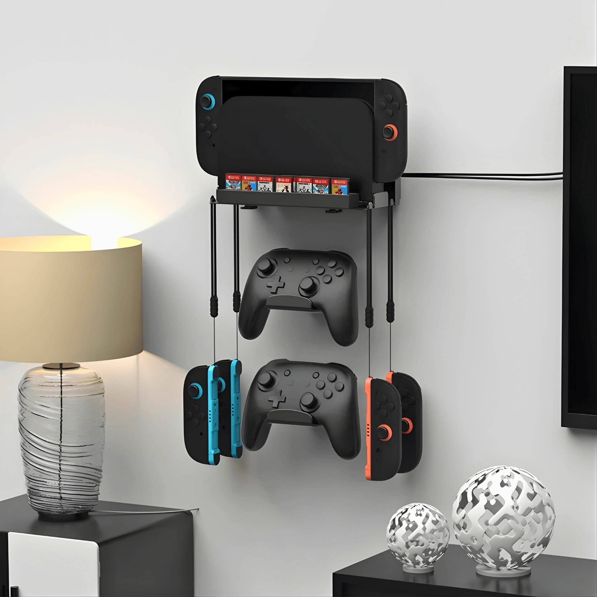 Cuenta con 28 ranuras para tarjetas de juego, soportes para los joy-cons o mandos, y una estructura diseñada para fijarse de forma segura en la pared. Así eliminas cables sueltos, mantienes el mueble libre y tus juegos organizados — todo al alcance de la mano.